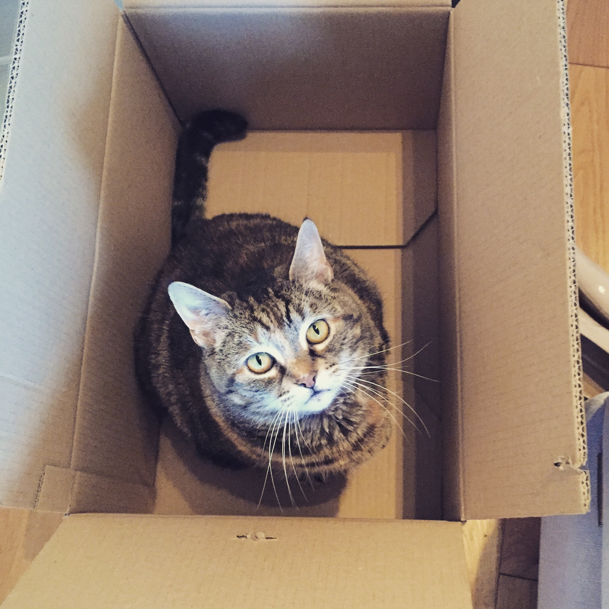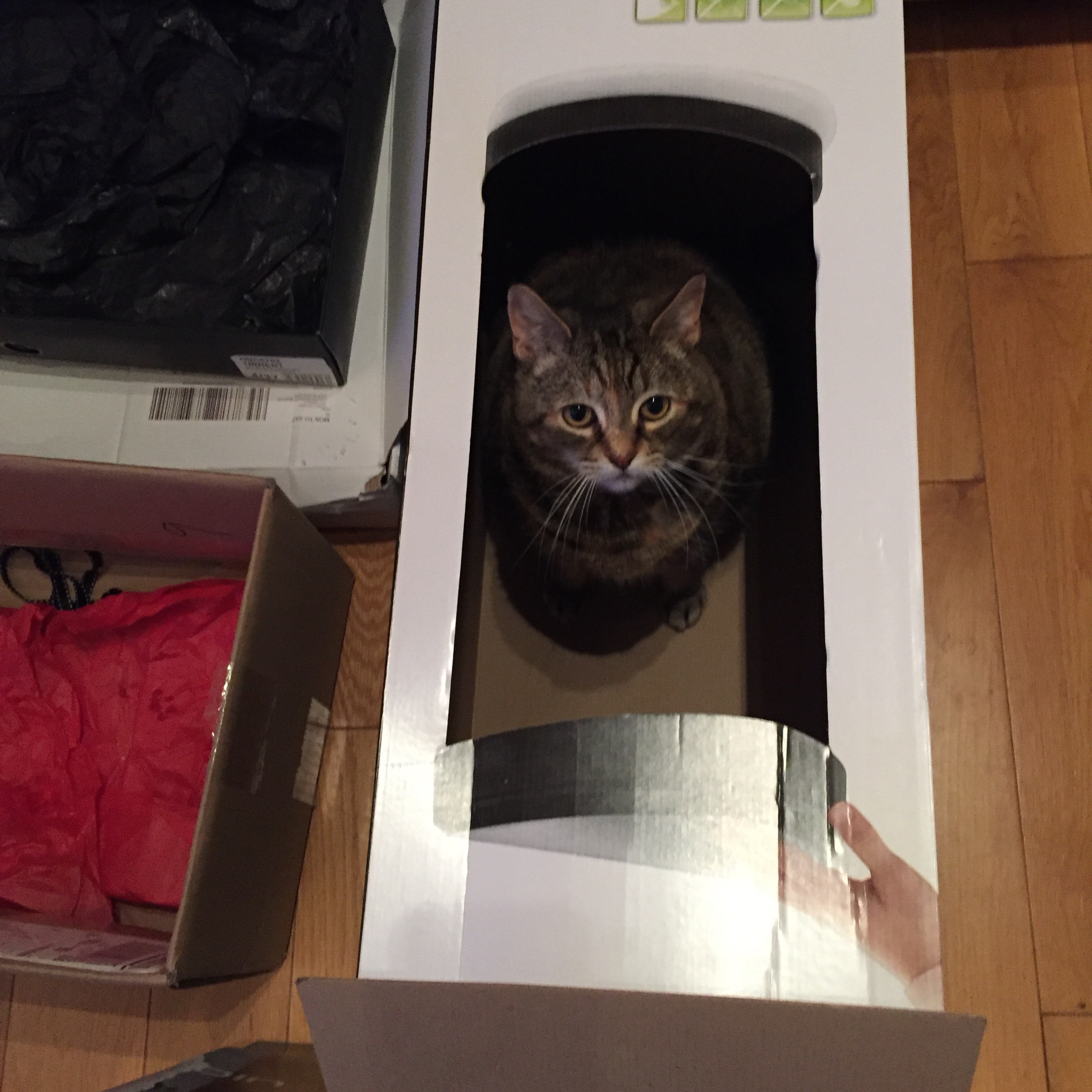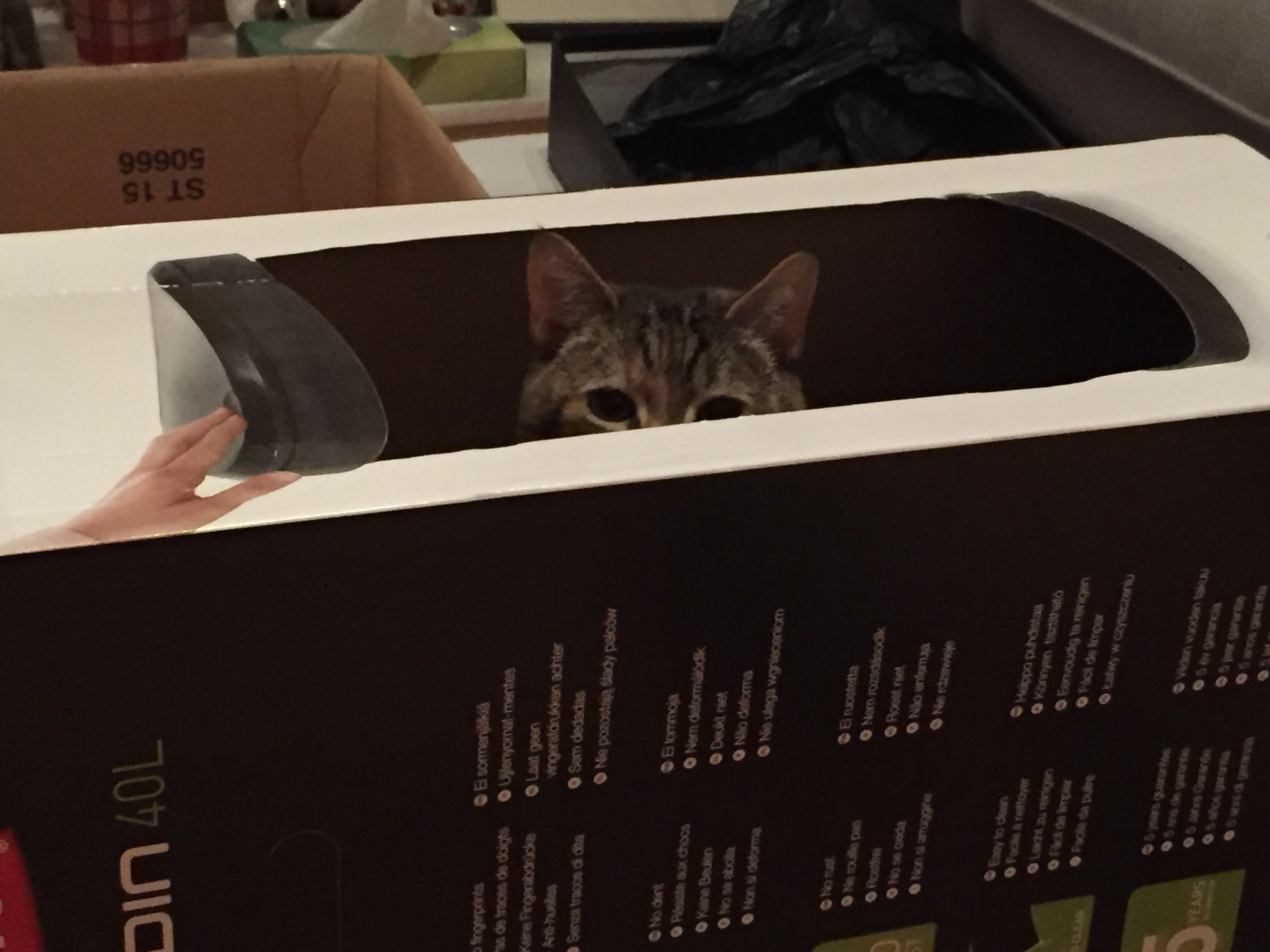 When I bought a new bin the box it came in had a hole in the front, which was perfect for her to sit in and judge me from, and it stayed in either the spare bedroom or living room for a few weeks.